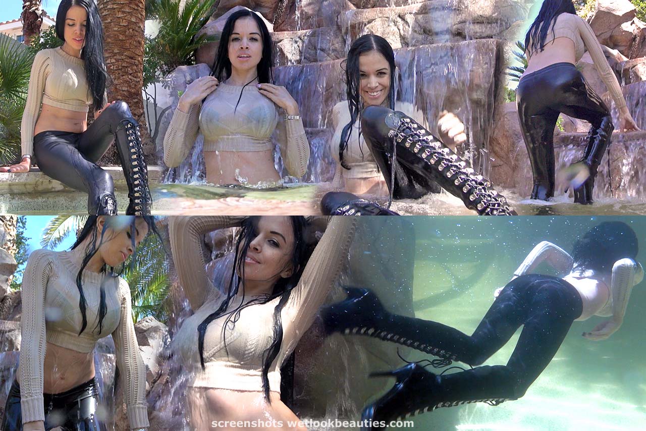 Tiffany wears these badass shiny leather boots with black shiny leggings and a beige crop top. And she looks so incredible hot in it! Maybe she feels so hot herself, that she needs to cool down. So she sits down at the edge of the pool and starts splashing water on her clothes. After a while she steps down into the pool and gets her pants wet even more, and she dips down more and more until she is fully covered in water.